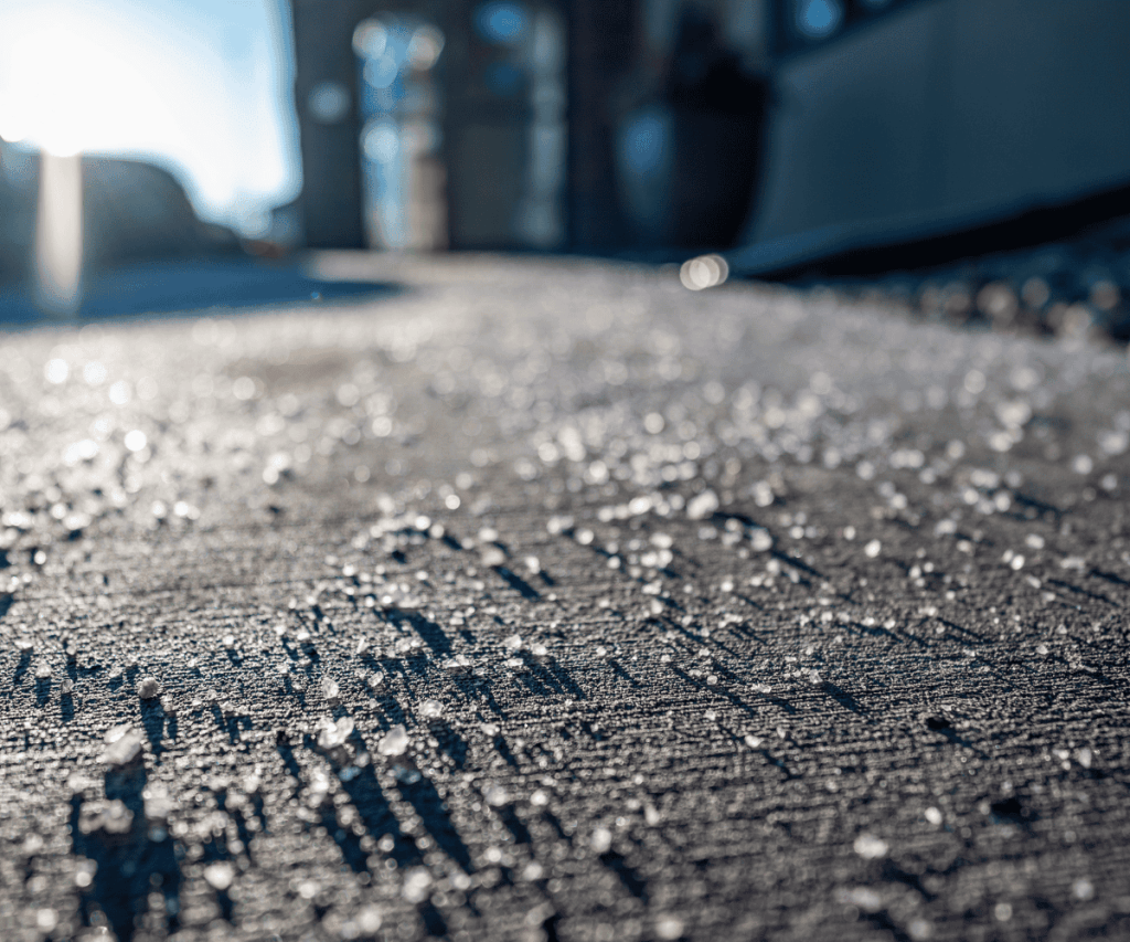 Rock salt is hygroscopic, meaning it attracts and holds moisture. When you apply salt to your driveway, it doesn’t just melt ice it actively pulls additional moisture from the air into your concrete’s pores.